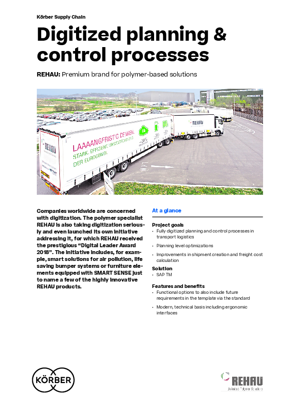 Mit dem SAP TM Template steuert REHAU sein globales Transportnetzwerk zentral und standardisiert – von der Versandartfindung über Packvorschriften bis zur Frachtkostenberechnung. Die Lösung berücksichtigt vielfältige logistische Anforderungen und wächst mit jedem Rollout weiter. Der Flyer zeigt, wie REHAU mit Körber eine skalierbare Plattform für die digitale Transportlogistik geschaffen hat.