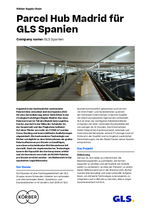 Angesichts der kontinuierlich wachsenden Paketströme entschied sich GLS Spanien 2022 für eine Zentralisierung seiner Aktivitäten in der strategisch wichtigen Region Madrid. Das neue Paketzentrum ist Teil des Madrid Gate Logistics Center, das sich in der Nähe der Autobahn A2, der Hauptstadt und des Flughafens befindet. Auf einer Fläche von mehr als 37.000 m2 werden Cross-Docking und innerstädtische Auslieferungen abgewickelt. Die hochmoderne Technologie von Körber ermöglicht es dem Unternehmen ein großes Paketaufkommen pro Stunde zu bewältigen, was einen entscheidenden Wettbewerbsvorteil darstellt. Dank der implementierten Technologie konnte die Kapazität des Sortiersystems erhöht und ein Durchsatz von mehr als 50.000 Paketen pro Stunde erreicht werden - ein Meilenstein in der spanischen Logistikbranche.
