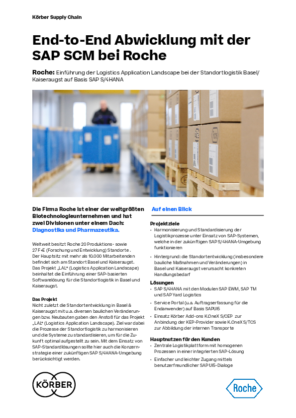 Mit der Einführung der Logistics Application Landscape (LAL) schafft Roche eine zentrale Plattform für die logistische Versorgung am Standort – inklusive Lagerverwaltung, Transportsteuerung und Yard Management. Die Lösung ermöglicht eine benutzerfreundliche Auftragserfassung, automatisierte Abläufe und eine transparente End-to-End-Prozesssteuerung. Der Flyer zeigt, wie Roche mit Körber die Grundlage für eine zukunftssichere Standortlogistik gelegt hat.