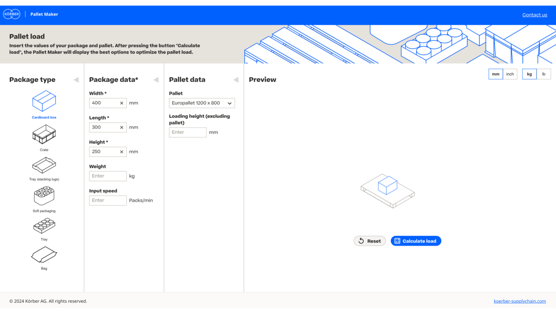 Körber's Pallet Maker is a powerful tool designed with exceptional ease of use. Simply enter your product dimensions, weight, and pallet specifications, and our intuitive software instantly calculates the optimal packing configuration, maximizing space utilization and minimizing shipping costs.