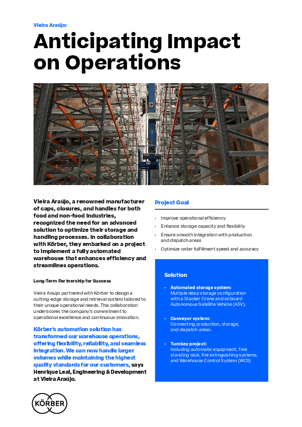 Vieira Araújo, a renowned manufacturer of caps, closures, and handles for both food and non-food industries, recognized the need for an advanced solution to optimize their storage and handling processes. In collaboration with Körber, they embarked on a project to implement a fully automated warehouse that enhances efficiency and streamlines operations.