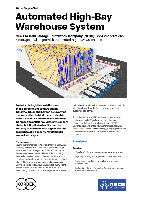 NECS boosts cold chain capacity and efficiency with Körber’s automated high-bay freezer warehouse solution.