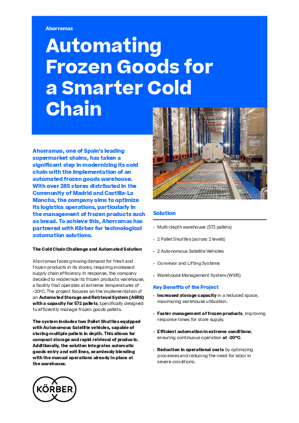 Ahorramas faces growing demand for fresh and frozen products in its stores, requiring increased supply chain efficiency. In response, the company decided to modernize its frozen products warehouse, a facility that operates at extreme temperatures of -20ºC. The project focuses on the implementation of an Automated Storage and Retrieval System (ASRS) with a capacity for 572 pallets, specifically designed to efficiently manage frozen goods pallets.