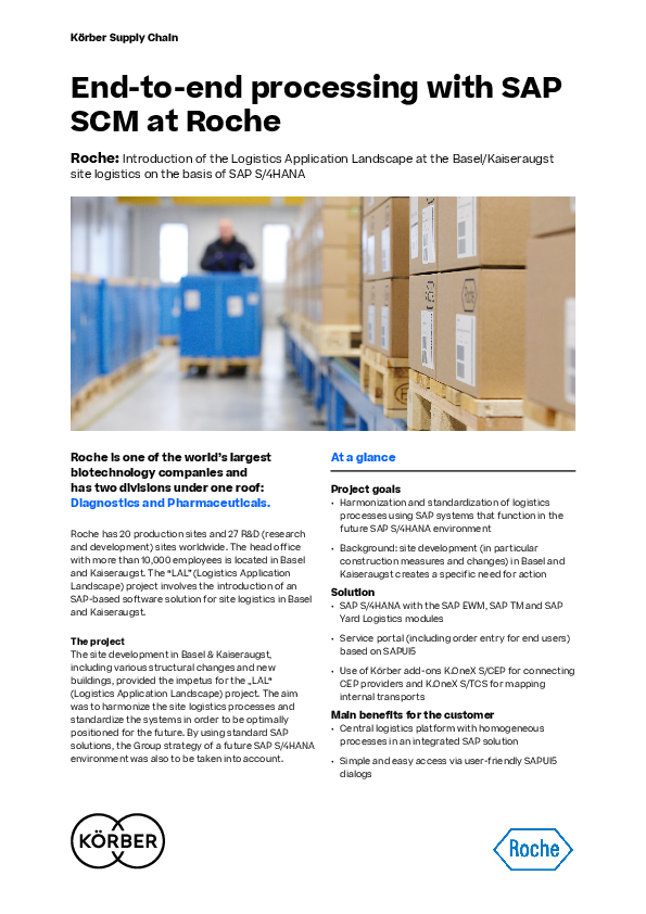 With the implementation of the Logistics Application Landscape (LAL), Roche has established a centralized platform for site-wide logistics – including warehouse management, transport control, and yard operations. The solution enables intuitive order entry, automated workflows, and transparent end-to-end process control. This case study highlights how Roche, in partnership with Körber, has laid the foundation for scalable, flexible, and future-proof site logistics.