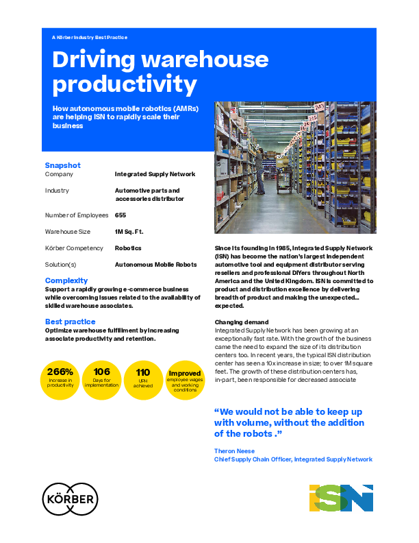 ISN, a rapidly growing e-commerce business was searching for a solution to overcome issues related to the availability of skilled warehouse associates. Having worked with Körber Supply Chain’s WMS successfully over the past ten years, ISN turned to Körber and its autonomous mobile robot (AMR) partner, Locus Robotics, to drive continued improvements throughout the warehouse. Read to understand how leveraging AMR increased picking speed, quality and accuracy, ultimately stabilizing the company’s workforce.