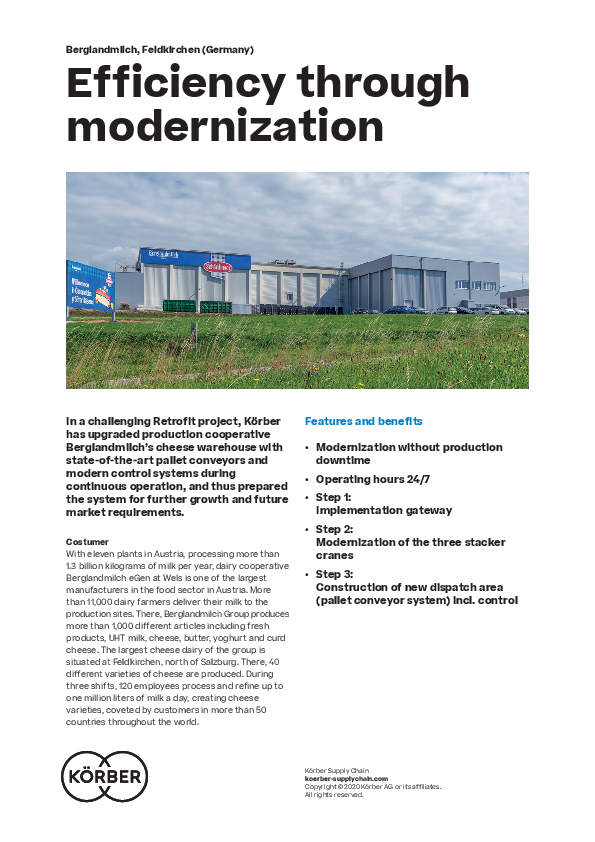In a challenging Retrofit project, Körber has upgraded production cooperative Berglandmilch’s cheese warehouse withstate-of-the-art pallet conveyors and modern control systems during continuous operation, and thus prepared the system for further growth and future market requirements.