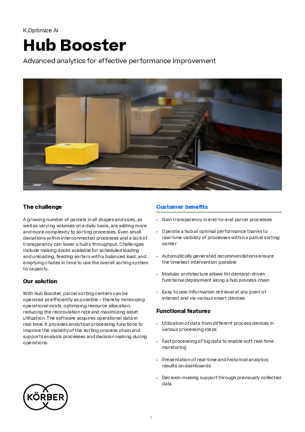 With Hub Booster, parcel sorting centers can be operated as efficiently as possible – thereby minimizing operational costs, optimizing resource allocation, reducing the recirculation rate and maximizing asset utilization. The software acquires operational data in real time. It provides analytical processing functions to improve the visibility of the sorting process chain and supports analysis processes and decision making during operations.