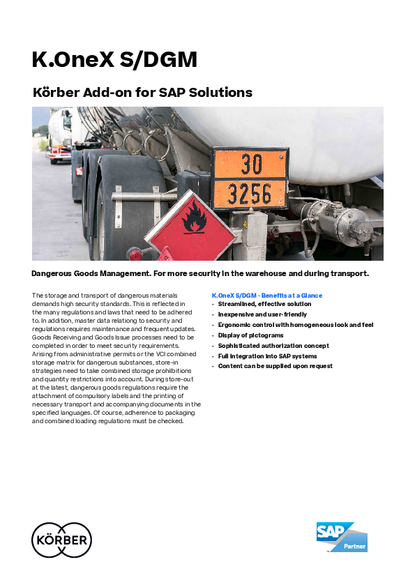 Handling and transporting hazardous materials requires precision and strict regulatory compliance. K.OneX S/DGM supports you directly within SAP, covering all safety-relevant requirements – from maintaining legally mandated master data and generating operating instructions to labeling, transport documentation, and storage compatibility rules. Download the flyer to discover how Körber helps you manage hazardous goods efficiently and in full compliance.