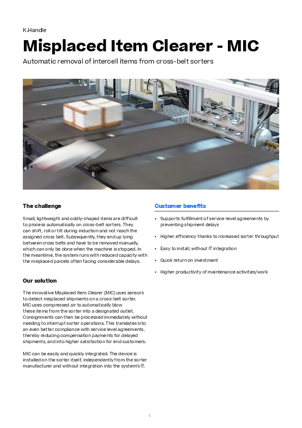 The innovative Misplaced Item Clearer (MIC) uses sensors to detect misplaced shipments on a cross-belt sorter. MIC uses compressed air to automatically blow these items from the sorter into a designated outlet. Consignments can then be processed immediately without needing to interrupt sorter operations. This translates into an even better compliance with service level agreements, thereby reducing compensation payments for delayed shipments, and into higher satisfaction for end customers. MIC can be easily and quickly integrated. The device is installed on the sorter itself, independently from the sorter manufacturer and without integration into the system’s IT.
