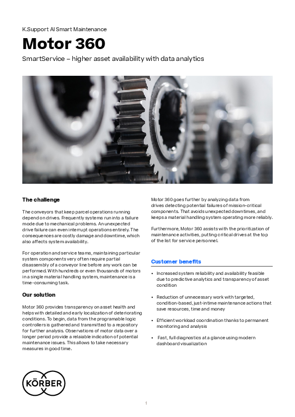 Motor 360 provides transparency on asset health and helps with detailed and early localization of deteriorating conditions. To begin, data from the programable logic controllers is gathered and transmitted to a repository for further analysis. Observations of motor data over a longer period provide a relaiable indication of potential maintenance issues. This allows to take necessary measures in good time.