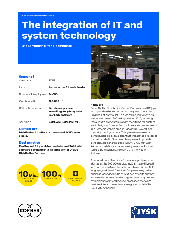JYSK leverages a SAP-based solution from Körber to streamline picking, replenishment, and shipping processes for both online and retail customers across Southeast Europe. The integrated system architecture enables dynamic inventory distribution, reduces transport mileage, and enhances service quality. This case study illustrates how JYSK responds to growth and evolving customer needs with flexible IT and scalable logistics processes.