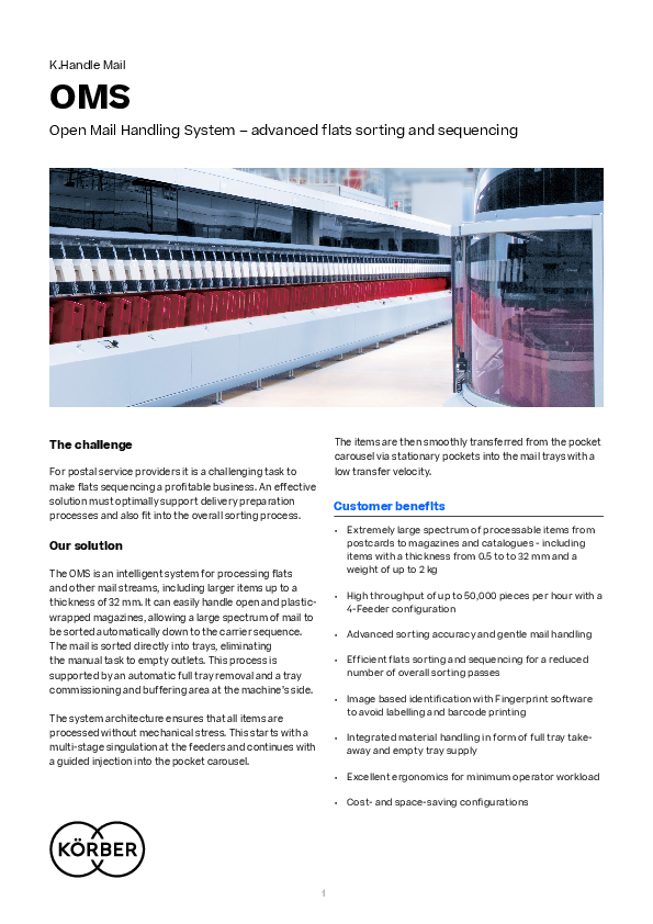 The OMS is a smart system for processing flats and rest mail streams all the way up to small parcels and packages (up to 32 mm thick). Even open and plastic-wrapped magazines are no longer an issue. That means that a large proportion of mail can be sorted automatically with the OMS – right down to the carrier sequence.