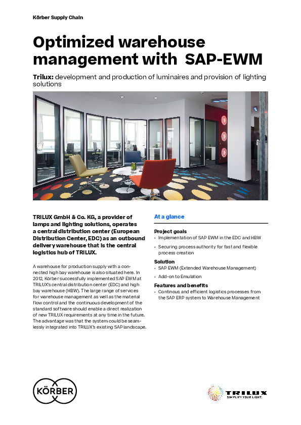 By implementing SAP EWM, TRILUX has established a unified logistics platform that intelligently connects warehouse and production processes. The solution enables flexible process design, full inventory and movement transparency, and efficient control of packaging, resources, and conveyor systems. This case study shows how TRILUX, with Körber’s support, has built a scalable and future-ready logistics infrastructure.