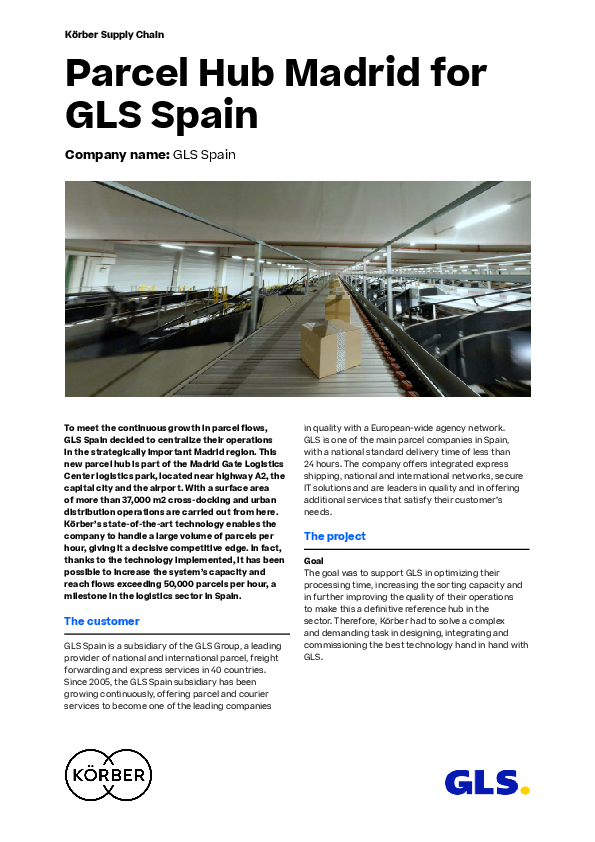 To meet the continuous growth in parcel flows, GLS Spain decided to centralize their operations in the strategically important Madrid region. This new parcel hub is part of the Madrid Gate Logistics Center logistics park, located near highway A2, the capital city and the airport. With a surface area of more than 37,000 m2 cross-docking and urban distribution operations are carried out from here. Körber’s state-of-the-art technology enables the company to handle a large volume of parcels per hour, giving it a decisive competitive edge. In fact, thanks to the technology implemented, it has been possible to increase the system’s capacity and reach flows exceeding 50,000 parcels per hour, a milestone in the logistics sector in Spain.