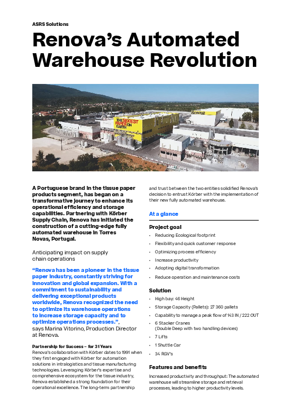 Renova’s collaboration with Körber dates to 1991 when they first engaged with Körber for automation solutions in intralogistics and tissue manufacturing technologies. Leveraging Körber’s expertise and comprehensive ecosystem for the tissue industry, Renova established a strong foundation for their operational excellence.