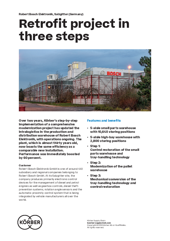 Körber’s step-by-step implementation of a comprehensive modernization project has updated the intralogistics of Robert Bosch Elektronik, with operations ongoing