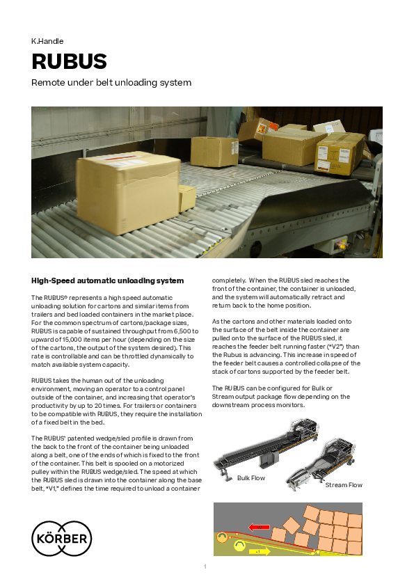 The RUBUS® represents a high speed automatic unloading solution for cartons and similar items from trailers and bed loaded containers in the market place. For the common spectrum of cartons/package sizes, RUBUS is capable of sustained throughput from 6,500 to upward of 15,000 items per hour (depending on the size of the cartons, the output of the system desired). This rate is controllable and can be throttled dynamically to match available system capacity.