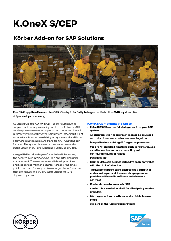 K.OneX S/CEP is the SAP add-on that fully embeds shipping workflows with parcel service providers into your SAP landscape – including label printing, end-of-day processing, and a dedicated shipping cockpit. With a unified interface, reduced complexity, and centralized support from Körber, you benefit from higher performance, fewer errors, and streamlined project execution. Download the flyer to discover how simple shipping in SAP can be.