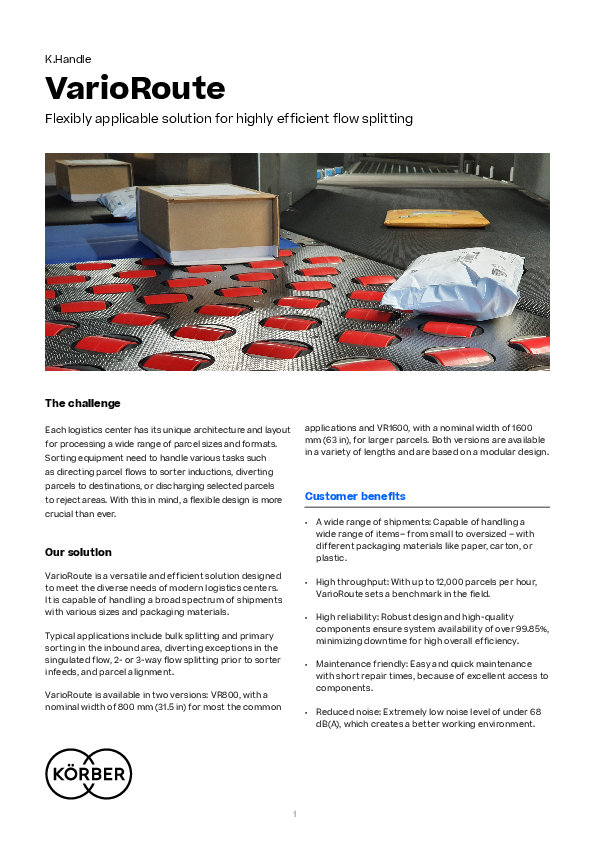 VarioRoute consists of a platform of individually controlled rollers that can transport a large variety of parcels in different directions. Its unique architecture of independently pivoting rows and individually driven rollers allows very reliable parcel manipulation. Each roller is driven by a motor integrated into the roller itself. The solution comes in two basic versions:VarioRoute 800 represents the most common product for daily use in parcel sorting. VarioRoute 1600 offers a larger transport width. Both provide a two- or three-way split. They are available in different lengths to meet a variety of requirements. A building-block system provides the possibility to use between four and 24 pivoting roller units (PRUs) in steps of two for VarioRoute 800 and eight to 48 PRUs for VarioRoute 1600.