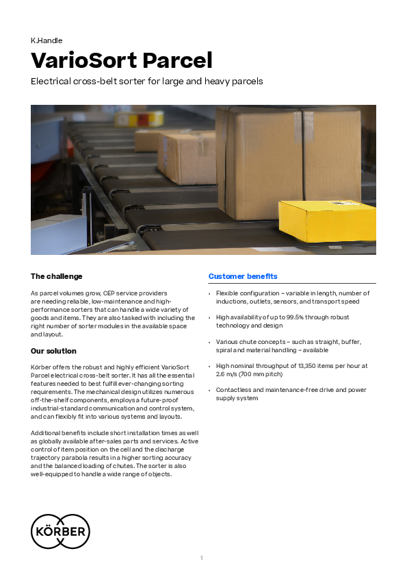 Körber offers the robust and highly efficient VarioSort Parcel electrical cross-belt sorter. It has all the essential features needed to best fulfill ever-changing sorting requirements. The mechanical design utilizes numerous off-the-shelf components, employs a future-proof industrial-standard communication and control system, and can flexibly fit into various systems and layouts. Additional benefits include short installation times as well as globally available after-sales parts and services. Active control of item position on the cell and the discharge trajectory parabola results in a higher sorting accuracy and the balanced loading of chutes. The sorter is also well-equipped to handle a wide range of objects.