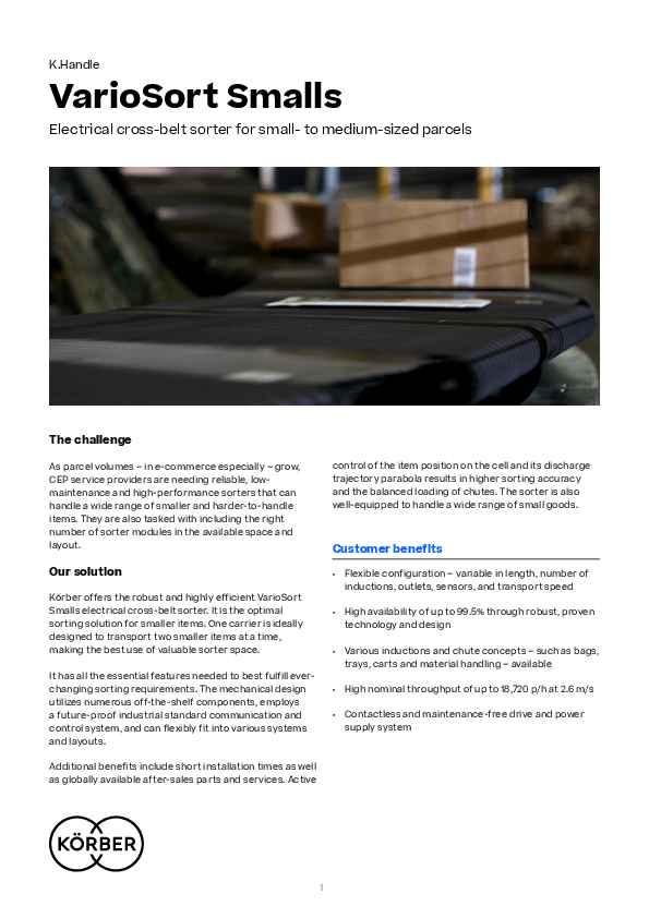 Körber offers the robust and highly efficient VarioSort Smalls electrical cross-belt sorter. It is the optimal sorting solution for smaller items. One carrier is ideally designed to transport two smaller items at a time, making the best use of valuable sorter space. It has all the essential features needed to best fulfill everchanging sorting requirements. The mechanical design utilizes numerous off-the-shelf components, employs a future-proof industrial standard communication and control system, and can flexibly fit into various systems and layouts. Additional benefits include short installation times as well as globally available after-sales parts and services. Active control of the item position on the cell and its discharge trajectory parabola results in higher sorting accuracy and the balanced loading of chutes. The sorter is also well-equipped to handle a wide range of small goods.