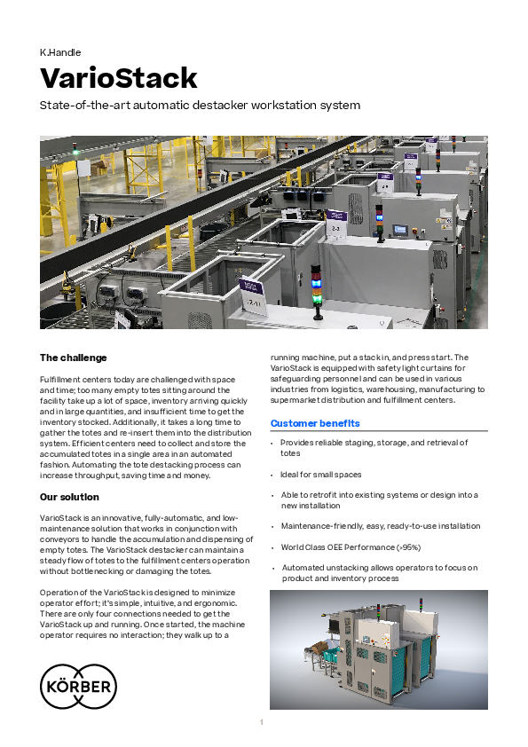 VarioStack is an innovative, fully-automatic, and low-maintenance solution that works in conjunction with conveyors to handle the accumulation and dispensing of empty totes. The VarioStack destacker can maintain a steady flow of totes to the fulfillment centers operation without bottlenecking or damaging the totes. Operation of the VarioStack is designed to minimize operator effort; it’s simple, intuitive, and ergonomic. There are only four connections needed to get the VarioStack up and running. Once started, the machine operator requires no interaction; they walk up to a running machine, put a stack in, and press start. The VarioStack is equipped with safety light curtains for safeguarding personnel and can be used in various industries from logistics, warehousing, manufacturing to supermarket distribution and fulfillment centers.