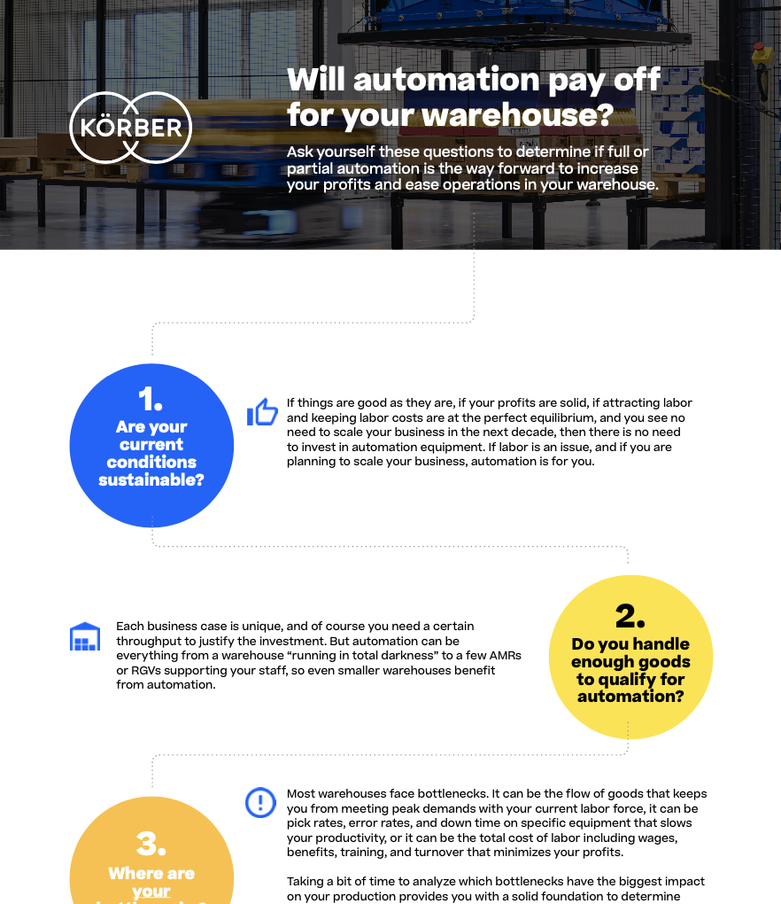 Considering automation for your warehouse but unsure where to start? Download Körber's Guide to the US Market to explore how automation can transform your operations. Gain insights into identifying bottlenecks, evaluating ROI, and planning scalable solutions tailored to your business needs.
