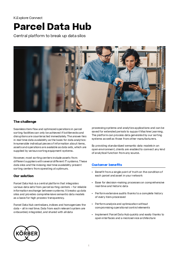 Parcel Data Hub is a central platform that integrates various data sets from parcel sorting centers – for reliable information exchange between systems. It breaks up data silos and provides comprehensive semantic data models as a basis for high process transparency. Parcel Data Hub centralizes, indices and homogenizes the data – all in real time. Data from each relevant system are onboarded, integrated, and shared with all data processing systems and analytics applications and can be saved for extended periods to support Machine Learning. The platform can process data generated by our sorting systems as well as those from other manufacturers.