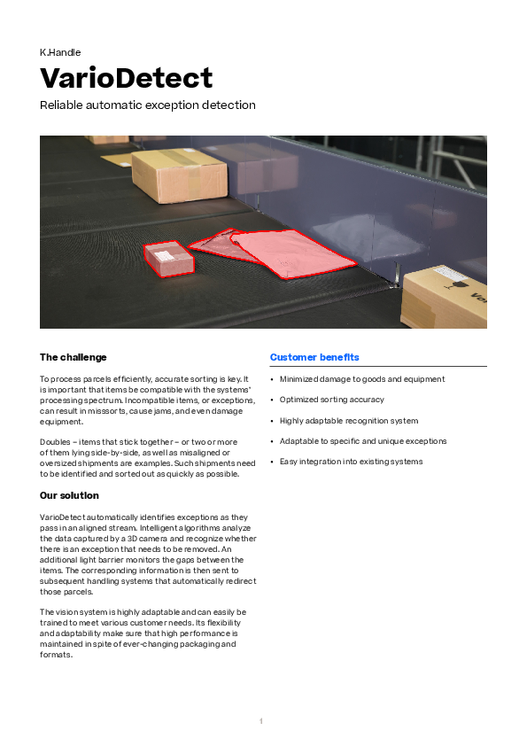 VarioDetect automatically identifies exceptions as they pass in an aligned stream. Intelligent algorithms analyze the data captured by a 3D camera and recognize whether there is an exception that needs to be removed. An additional light barrier monitors the gaps between the items. The corresponding information is then sent to subsequent handling systems that automatically redirect those parcels. The vision system is highly adaptable and can easily be trained to meet various customer needs. Its flexibility and adaptability make sure that high performance is maintained in spite of ever-changing packaging and formats.